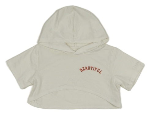 Bílé bolérko s nápisem a kapucí