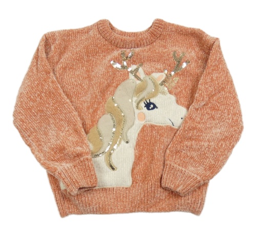 Růžový žinylkový svetr s jednorožcem z flitrů C&A