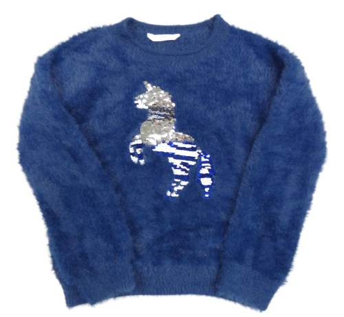 Tmavomodrý chlupatý svetr s jednorožcem z flitrů M&S