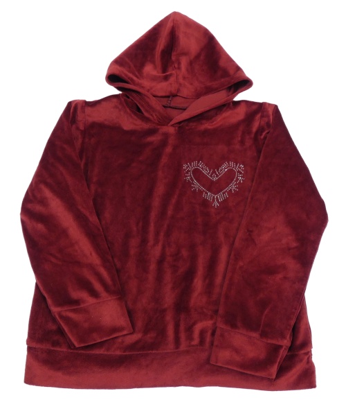 Vínová plyšová mikina se srdcem z kamínků a kapucí