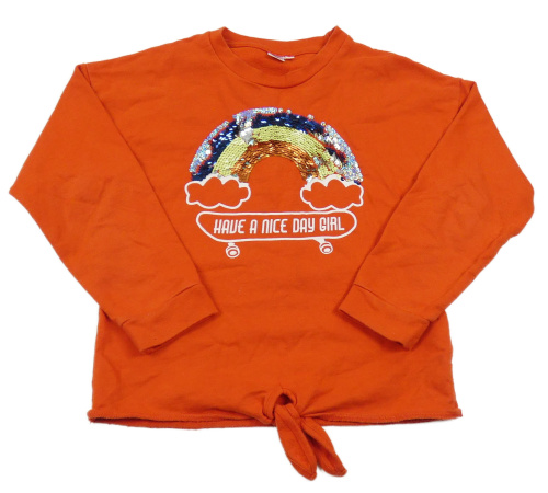 Červená mikina s duhou z překlápěcích flitrů a obláčky a skateboardem a uzlem