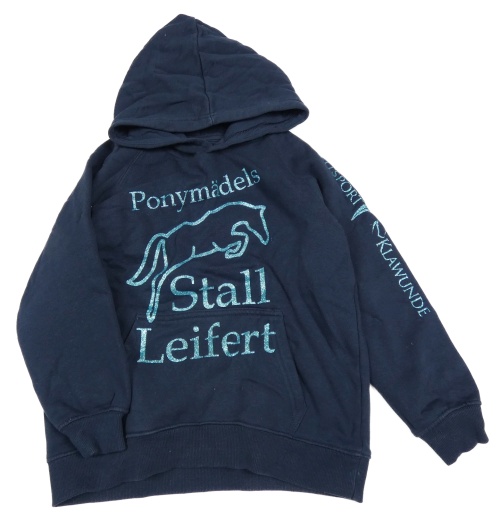 Tmavomodrá mikina s koněm a nápisy a kapucí