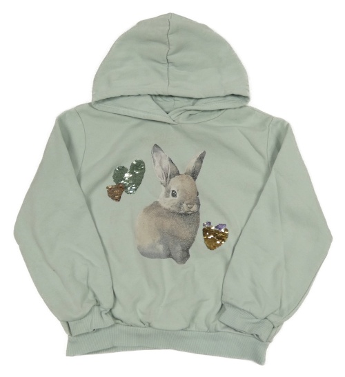 Světleolivová mikina s králíčkem a srdíčky z překlápěcích flitrů a kapucí H&M