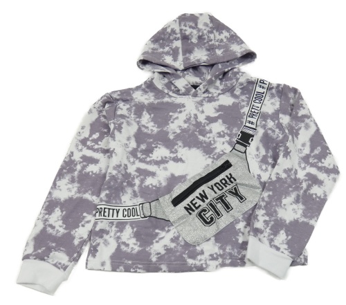 Fialovo-bílá batikovaná crop mikina s tištěnou kabelkou a kapucí Y.F.K.
