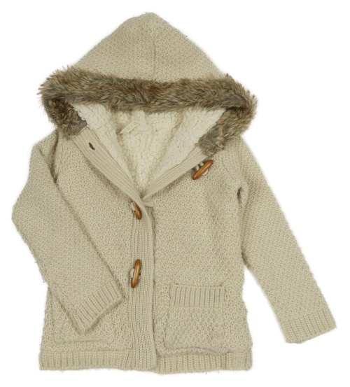 Smetanový pletený zateplený propínací svetr s kapucí s kožešinou Yd.