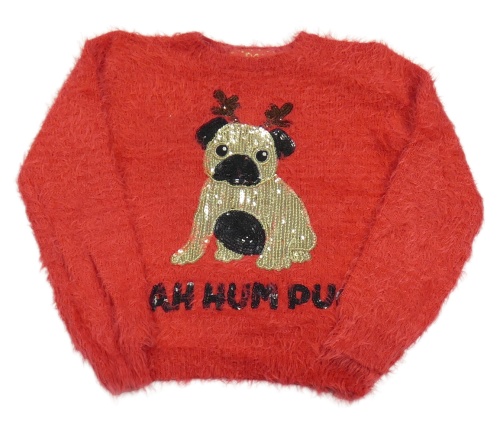 Červený chlupatý svetr s mopsem z flitrů Primark