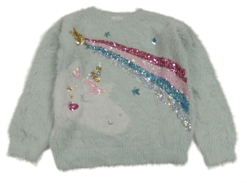 Světlemodrý chlupatý svetr s jednorožcem a duhou z flitrů F&F