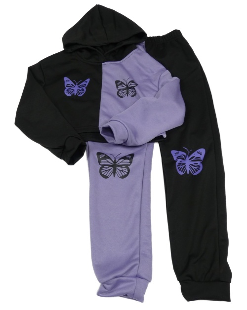 2 set - fialovo-černá crop mikina s motýlky a kapucí + tepláky shein