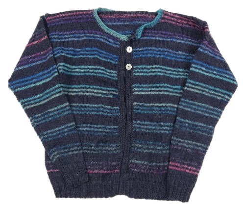 Tmavomodro-barevný pruhovaný melírovaný pletený propínací svetr
