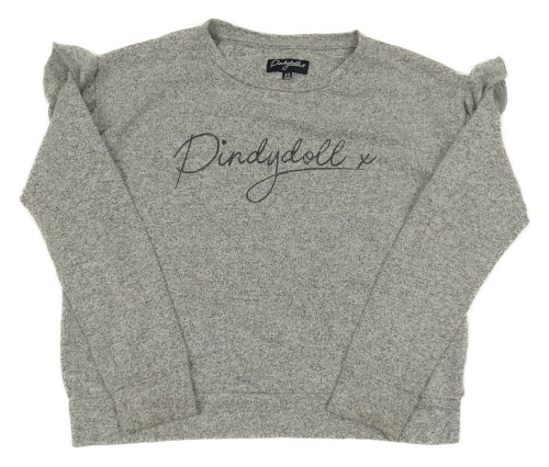 Šedý melírovaný úpletový oversize svetr s logem a volánky Pidydoll
