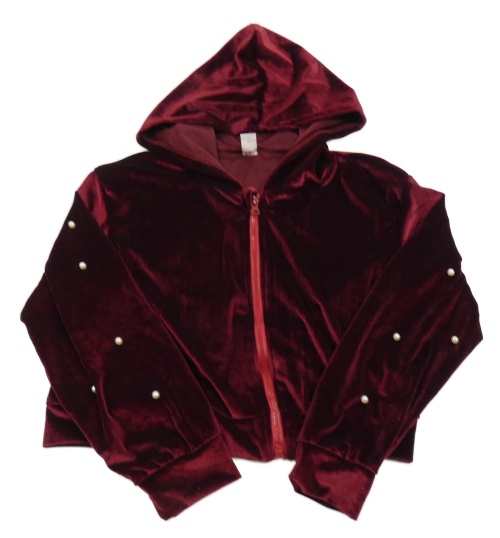 Vínová sametová propínací mikina s perlami na rukávech a kapucí Shein