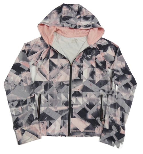 Světlerůžovo-šedá vzorovaná sportovní propínací crop mikina s kapucí