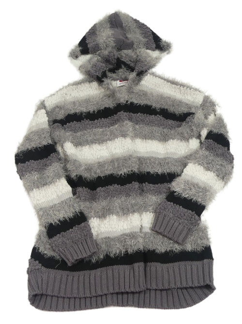 Šedo-černo-bílý pruhovaný chlupatý svetrový cardigan s kapucí Yigga