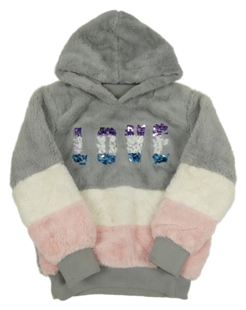 Šedo-bílo-růžová chlupatá podšitá mikina s nápisem z flitrů a kapucí