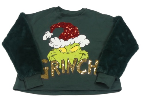 Tmavozelená mikina s Grinchem a chlupatými rukávy