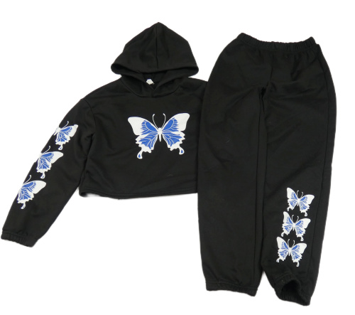 2 set - Černá crop mikina s motýlkem a kapucí + tepláky s motýlky shein