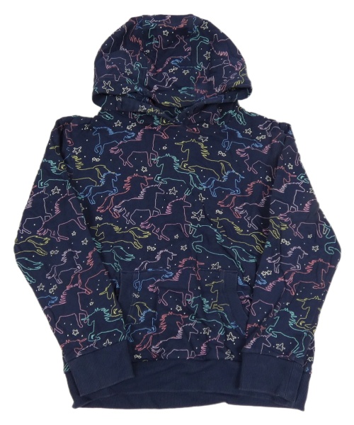 Tmavomodrá mikina s jednorožci a kapsou a kapucí