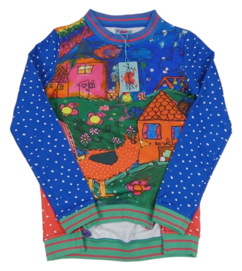 Nové - Modro-červeno-zelená mikina s domky a květy