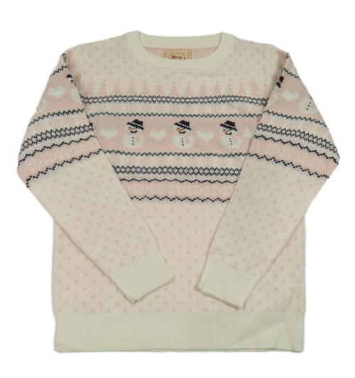 Bílo-světlerůžovo-černý pletený svetr se sněhuláčky a norským vzorem