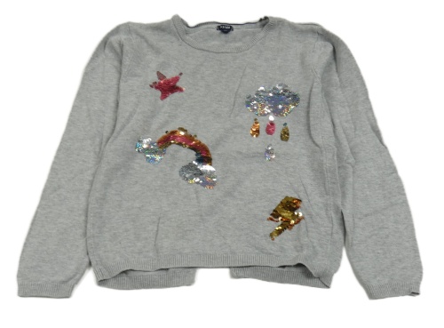Světlešedý svetr s obrázky z flitrů kiabi