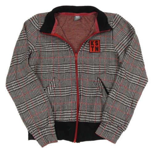Šedo-černo-červená vzorovano/kostkovaná propínací mikina s nášivkou