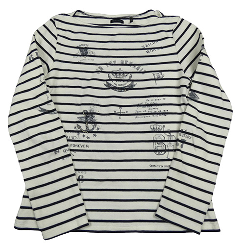 Bílo-tmavomodré pruhované mikinotriko s obrázky a nápisem