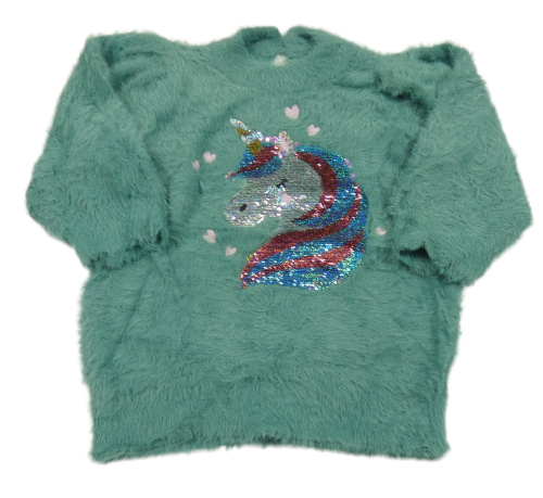 Tmavozelený chlupatý svetr s jednorožcem z flitrů Sinsay