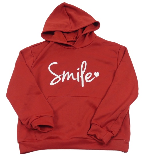 Tmavočervená mikina s nápisem a srdíčkem a kapsou a kapucí