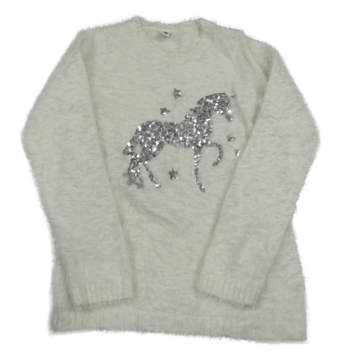 Bílý chlupatý svetr s jednorožcem z flitrů Yigga