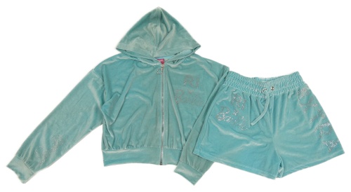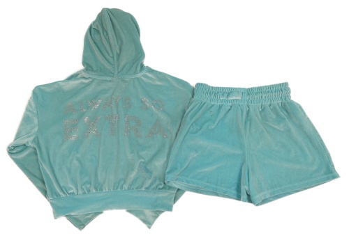 • 2Set - Mentolová sametová propínací oversize crop mikina s logy z kamínků a kapucí + kraťasy Barbie
