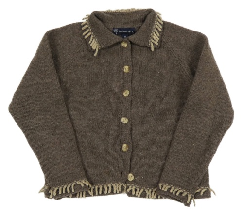 Hnědý vlněný propínací svetr s třásněmi
