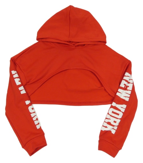 Červená crop mikina s nápisem na rukávech a kapucí