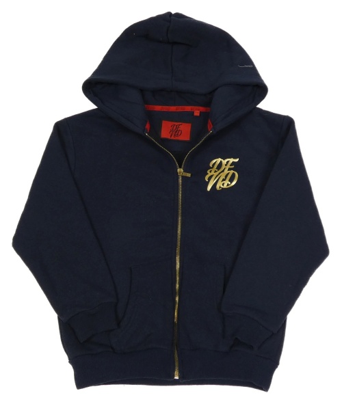 Tmavomodrá teplá propínací mikina se zlatým logem a kapucí DFND