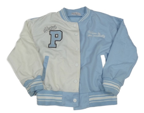 Světlemodro-bílá baseballová mikina s nápisy a písmenem