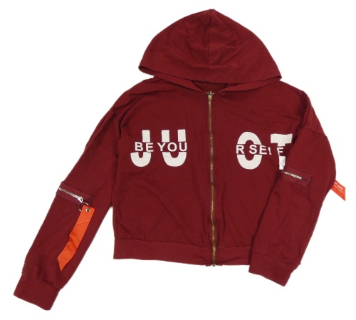 Vínová lehká propínací crop mikina s nápisem a kapucí