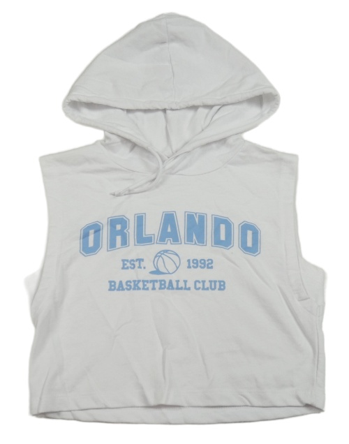 Bílá crop tepláková vesta s modrým nápisem a kapucí