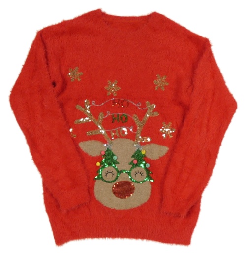 Červený chlupatý svetr se sobem s flitry St. Bernard