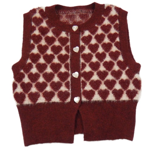 Tmavovínovo-bílo/světlerůžová chlupatá propínací svetrová crop vesta se srdíčky