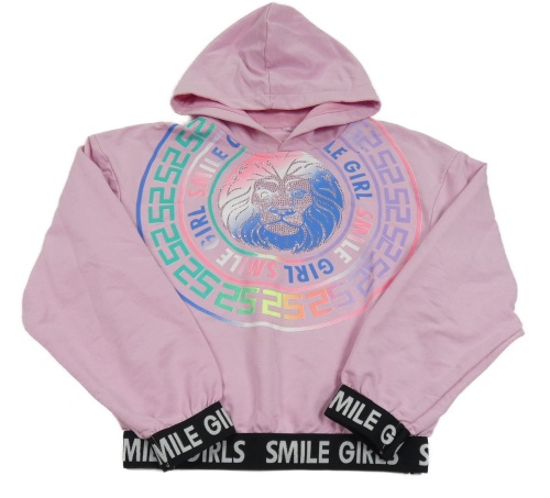 Světlerůžovo-černá crop mikina se lvem s kamínky a nápisy a kapucí