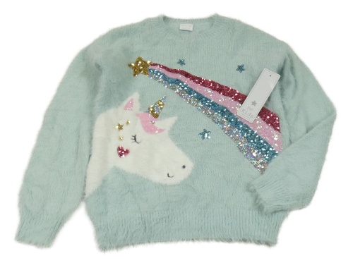 Nové - světlemodrý chlupatý svetr s jednorožcem a duhou z flitrů F&F