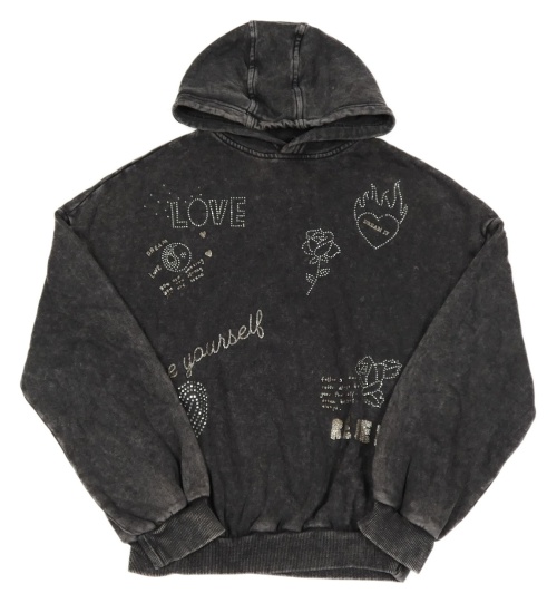 Tmavošedá šisovaná mikina s růžemi a srdíčky z kamínků a kapucí George