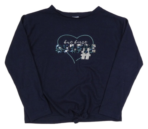 Tmavomodrý lehký svetr s nápisem z flitrů Y.F.K.
