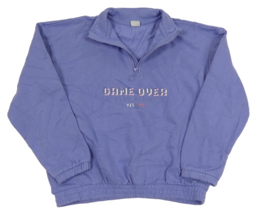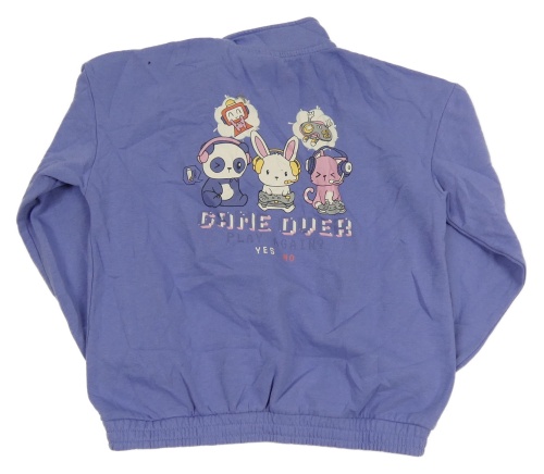 Fialová oversize mikina s nápisem a obrázkem na zádech