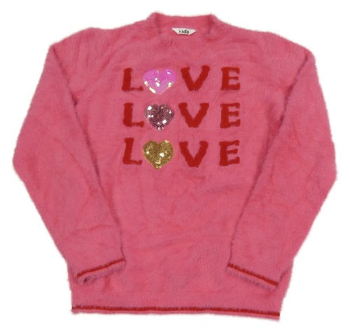 Růžový chlupatý svetr s nápisy a srdíčky z flitrů M&Co.