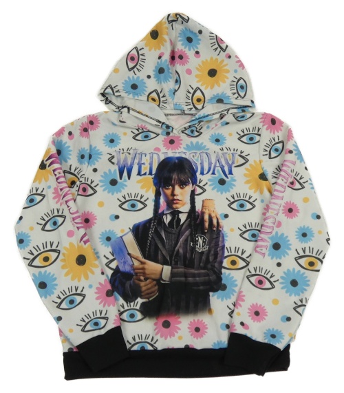 Bílo-barevno-černá mikina s potiskem - Wednesday a kapucí