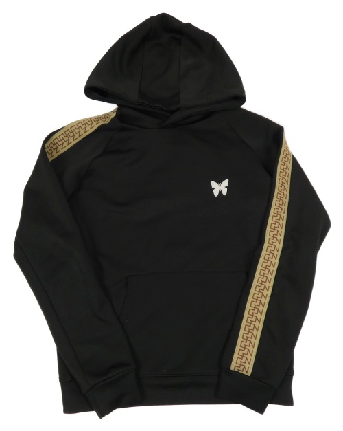 Černá sportovní mikina s béžovým pruhem a motýlkem a kapucí