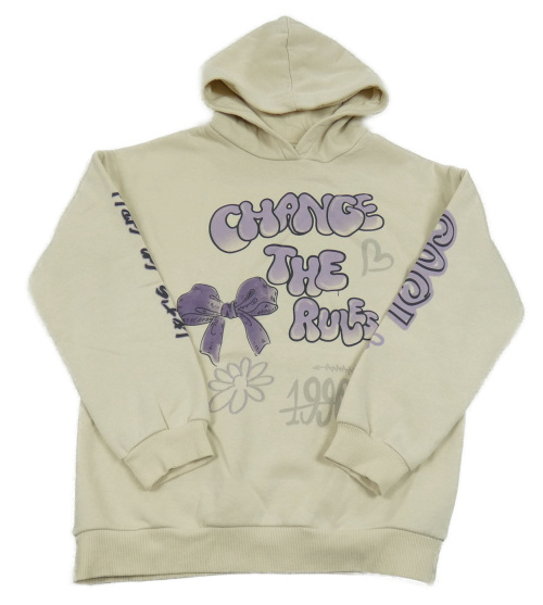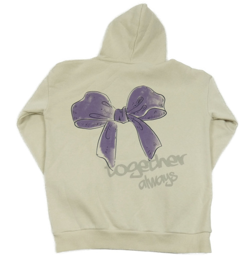 Smetanová mikina s fialovým nápisem a mašlí a kapucí C&A