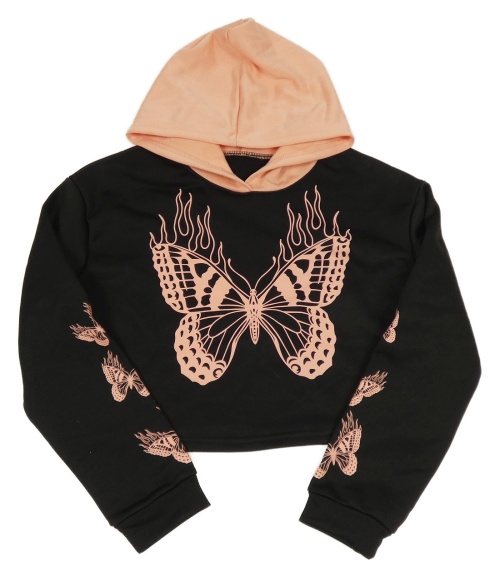 Čero-lososová crop mikina s motýlem a kapucí