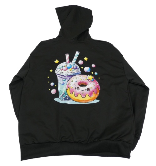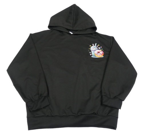 Černá mikina s nápojem a donutem a kapucí
