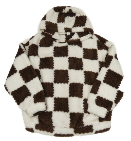 Hnědo-bílá kostkovaná chlupatá mikina s kapucí Shein